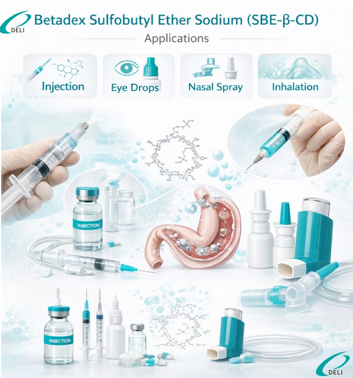 Sulfobutyl Ether Beta Cyclodextrin Sodium Injection Grade to wysoce rozpuszczalna w wodzie anionowa pochodna cyklodekstryny przeznaczona do zastosowań farmaceutycznych. Produkt ten, wytwarzany przez Xi'an DELI Biochemical Industry Co., Ltd., jest szeroko stosowany jako farmaceutyczna zaróbka poprawiająca rozpuszczalność, stabilność i bezpieczeństwo słabo rozpuszczalnych w wodzie aktywnych składników farmaceutycznych (API), szczególnie w preparatach do wstrzykiwań.